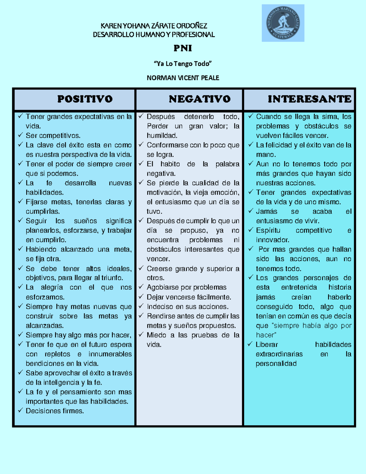 P.N.I. significa positivo, negativo e interesante. su objetivo es considerar por separado sus aspectos positivos y negativo, así como otros que no caiga en ninguna de las primeras dos casillas. se busca separado la exploración ´´positivo´´ de la ´´negativo´``, suspendiendo temporalmente las intuiciones globales sobre si una idea es buena o mala.